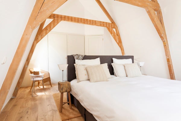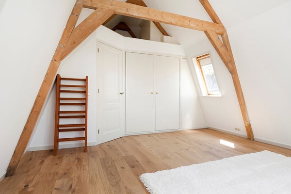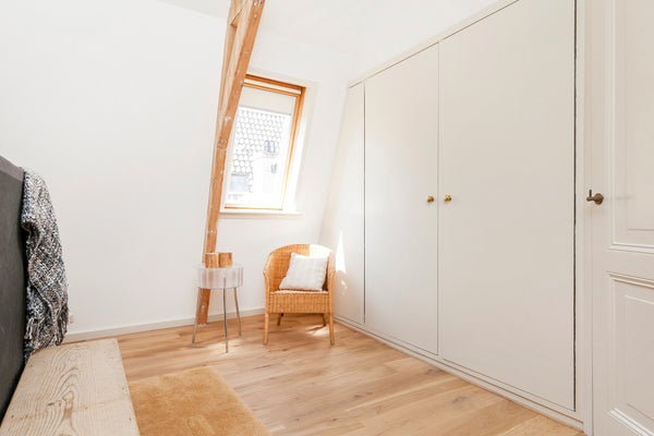 The master bedroom, located at the front, features built-in cupboards and original wooden beams that contribute to the apartment’s unique character. The spacious second bedroom, located at the rear, also includes built-in cupboards and an additional storage space, accesible by stairs. This room also provides access to a cozy roof terrace—perfect for unwinding after a busy day.