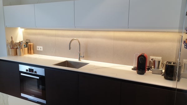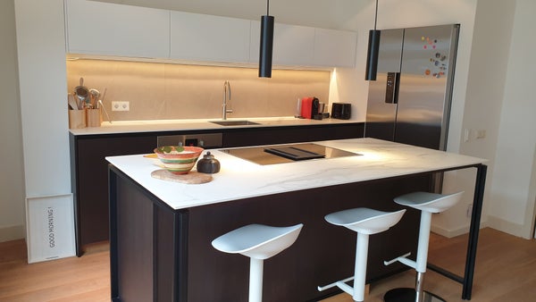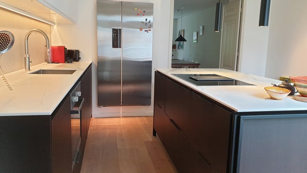 Adjacent to the living room is the spacious, newly renovated kitchen, featuring a cooking island and abundant storage. Equipped with high-end appliances, including a built-in induction stove with integrated extraction, oven, American fridge-freezer, dishwasher, and a Quooker tap, this kitchen is a chef’s dream. A separate laundry room at the rear includes a washing machine, dryer, and additional freezer.