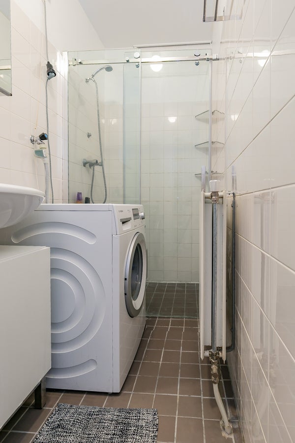 Toilet, walk-in shower, washbasin, washbasin furniture, washing machine connection