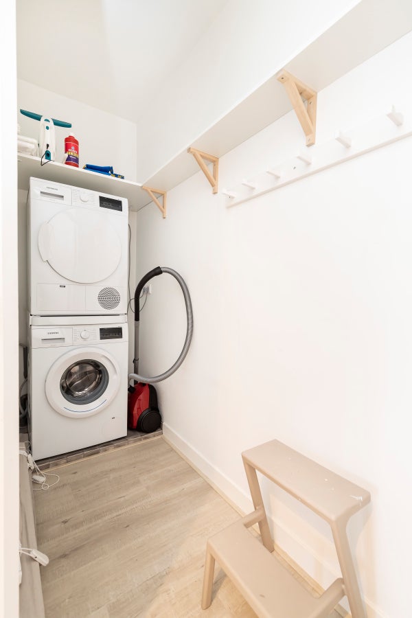 In the hallway you’ll also find a practical laundry room with storage space, including a washer and dryer. The bathroom is finished to a high standard, featuring double sinks, a walk-in shower and a toilet.